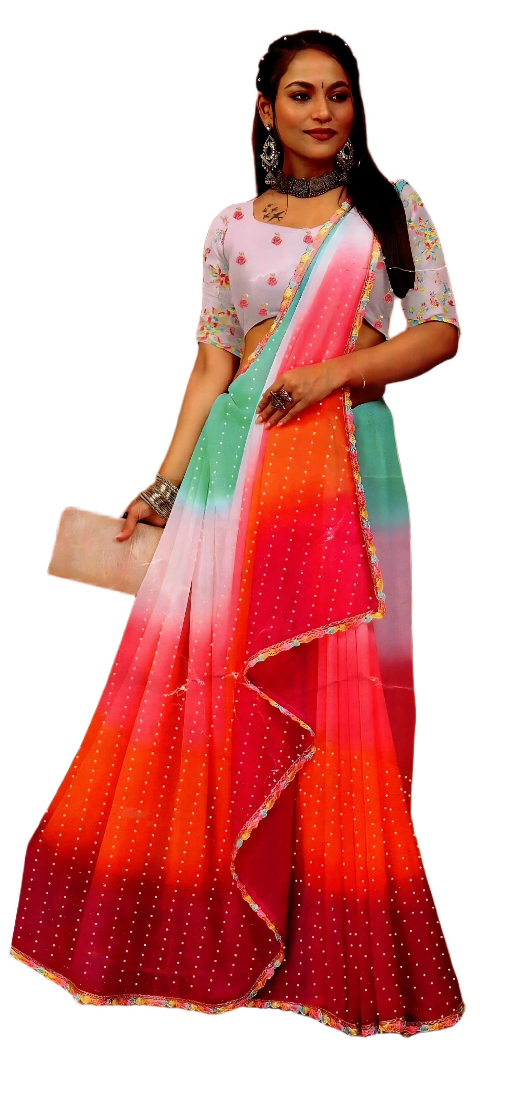 Adorn yourself in timeless grace with our beautiful Women's Georgette Saree with Subtle Embroidery. This elegant saree is a perfect blend of modern simplicity and traditional charm, designed for women who appreciate understated sophistication. Crafted from premium, lightweight georgette fabric, this saree offers an effortlessly graceful drape and a comfortable feel, allowing you to move with ease and confidence throughout any event. The fabric's fluid texture and soft fall make it an ideal choice for both formal and casual gatherings. The true highlight of this saree is its subtle embroidery, which is thoughtfully placed to create a delicate and refined look. The intricate needlework adds a touch of artisanal beauty without being overpowering, giving the saree a sophisticated and exclusive appeal. The minimalist yet intricate design ensures that this piece remains timeless and versatile, suitable for a variety of occasions from festive celebrations to elegant evening parties. The embroidery catches the light just enough to draw attention to its fine craftsmanship, adding to the saree's overall charm. Accompanying the saree is a striking white embroidered unstitched blouse piece.
